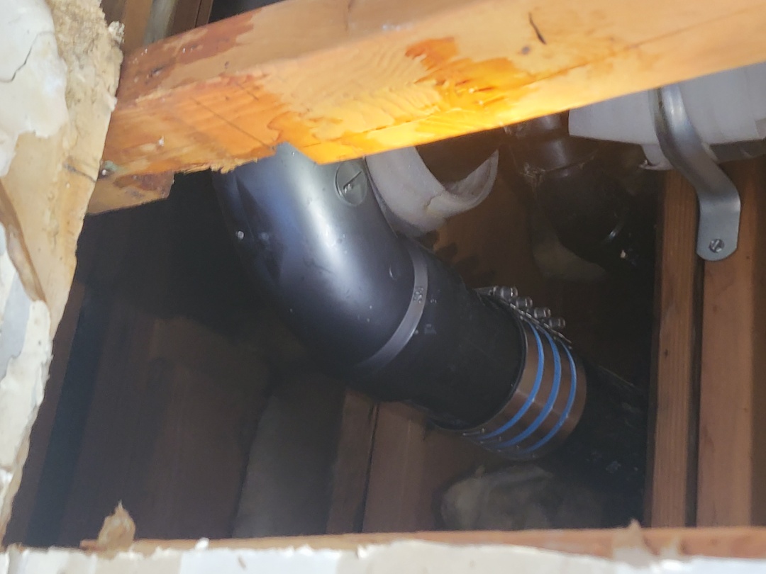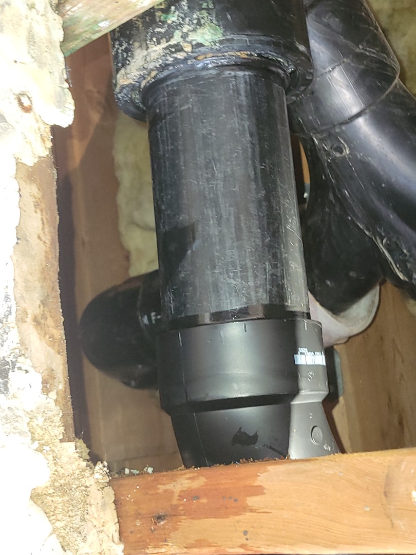 Cracked ABS between floors to drain in garage. Behind toilet. City heights