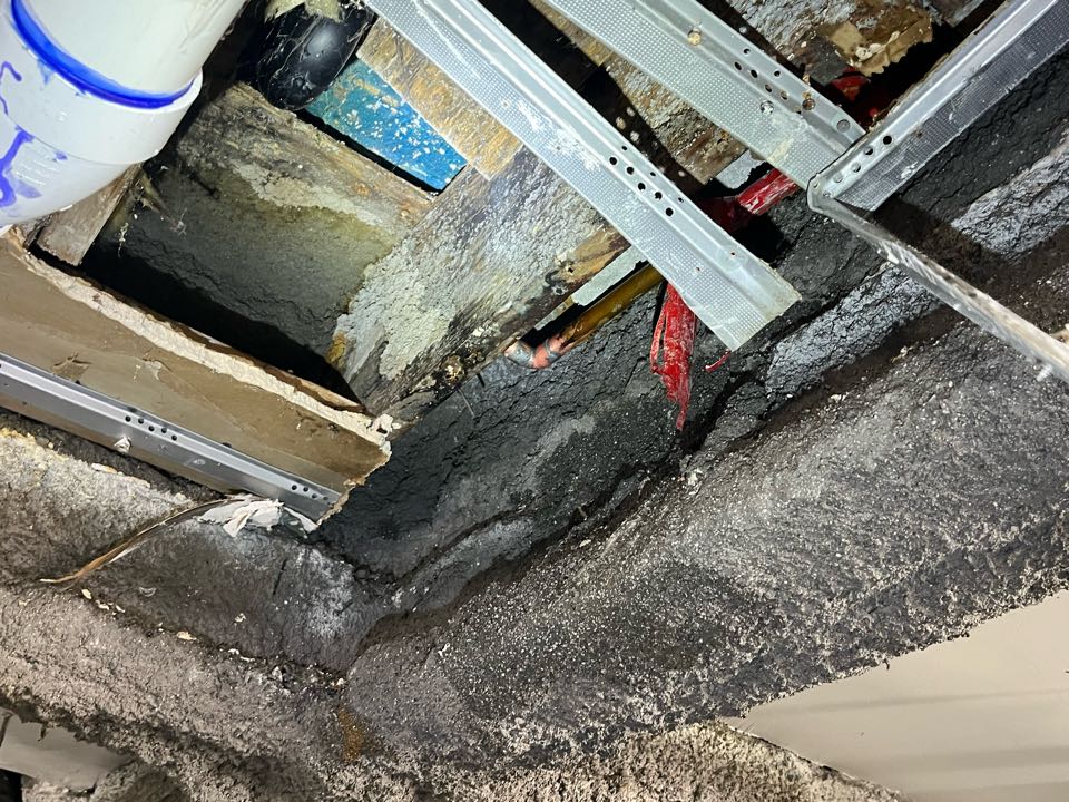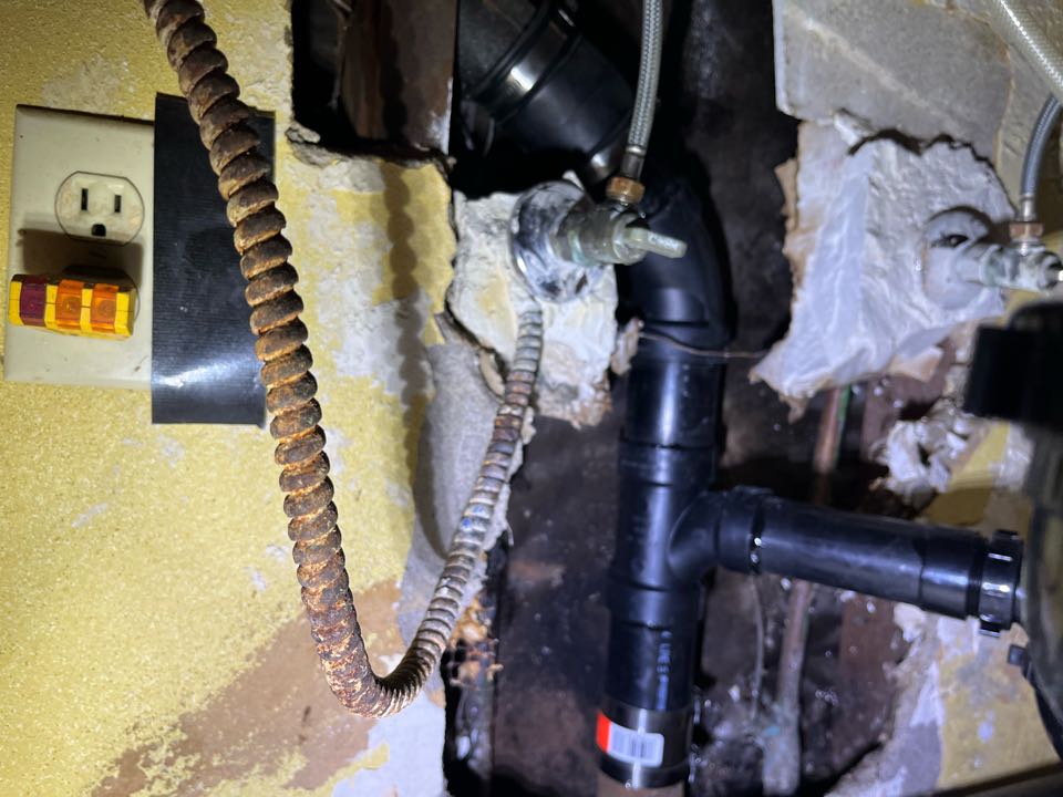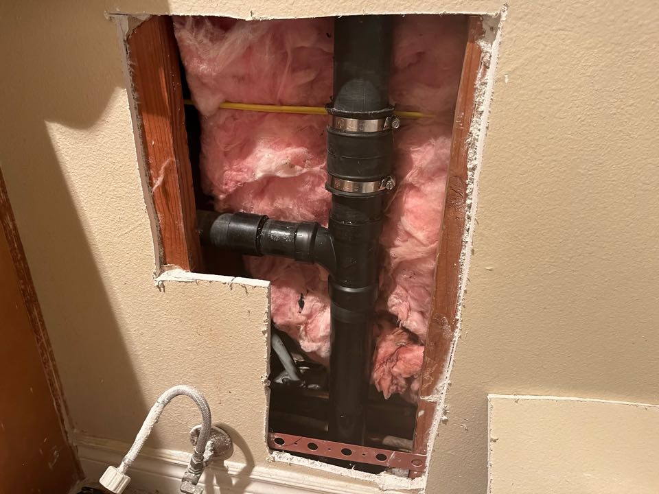 Leak in old cast-iron drain in wall behind kitchen sink. Cable drain to remove buildup. Build new ABS drain and under sink drains. Clare.